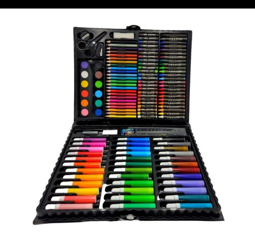 Consists of oil pastels, crayons, color pencils, markers, watercolor cakes with different colors, an HB pencil, paintbrush, ruler, eraser, palette, pencil sharpener, sponge, stapler etc.