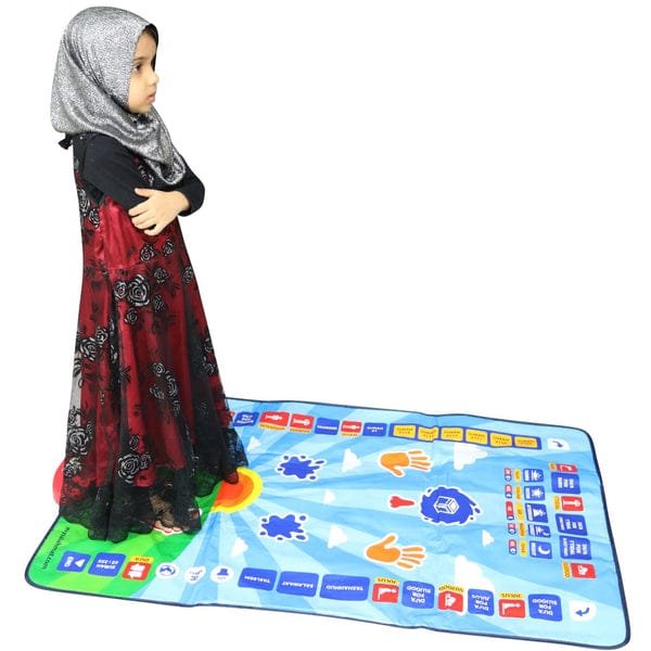 My Salah Mat is a prayer mat designed to educate children on how to perform the Muslim prayer in a fun and enjoyable way. The interactive prayer mat is touch-sensitive and has pre-recorded keys that can be touched to reveal the sound, such as prayer times, how to do wudu, recite surahs, say duas, and much more. It can teach about the different times of salah, and the various bodily movements and positions, and what to say during them. In order to make the learning process easy, My Salah Mat will guide the user through *two rakat* of salah using a simple to understand format.